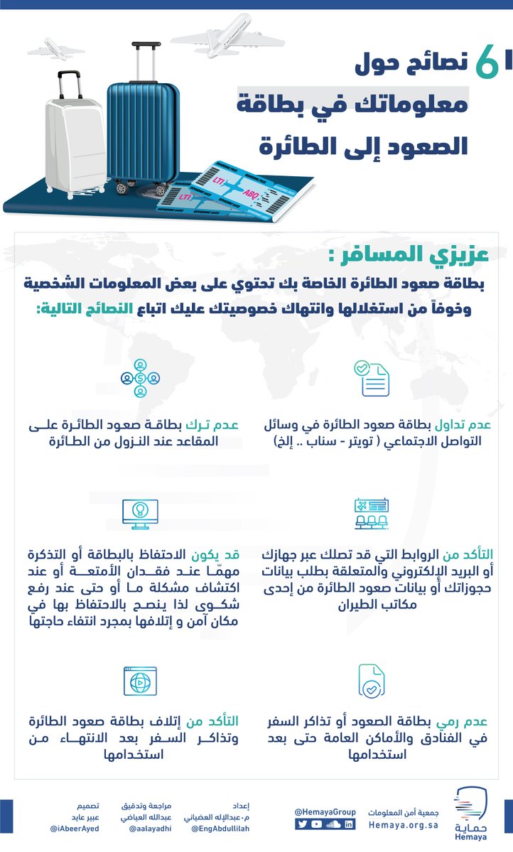 أنشطتنا, انفوجرافيك انفوجرافيك: 6 نصائح حول معلوماتك في بطاقة الصعود إلى الطائرة 14 أغسطس، 2022 By Sabaa 0 Comment 1097 Views تحتوي بطاقة صعود الطائرة على بعض المعلومات الشخصية، وحفاظًا على خصوصيتك نقّدم هذه النصائح حول المحافظة على معلوماتك