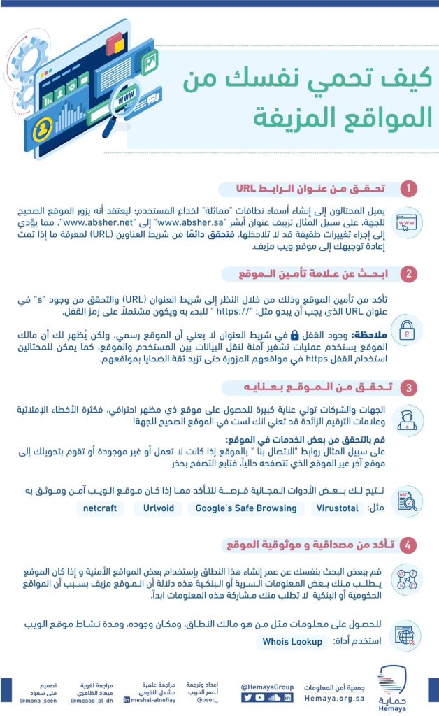 أنشطتنا, انفوجرافيك انفوجرافيك: كيف تحمي نفسك من المواقع المزيفة 16 أكتوبر، 2022 By Sabaa 0 Comment 2238 Views تصفحك لمواقع غير موثوقة قد يؤدي إلى وصول برامج خبيثة لجهازك أو الوقوع ضحية للاحتيال الإلكتروني تعرف على أهم النصائح للتحقق من مصداقية المواقع الإلكترونية