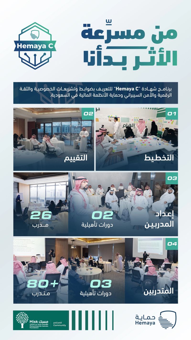 أنشطتنا, الأخبار, مشاركات مجتمعية برنامج Hemaya C: لتعزيز الثقة الرقمية والأمن السيبراني 19 سبتمبر، 2025 By Sabaa 0 Comment 1645 Views بمنحة من مسك، أقامت جمعية أمن المعلومات برنامج شهادة “Hemaya C”، المعني بالتعريف بالضوابط والتنظيمات الخاصة بحماية البيانات والثقة الرقمية وبالأمن السيبراني و حماية النظم المالية في المملكة. مشاهد من البرنامج: