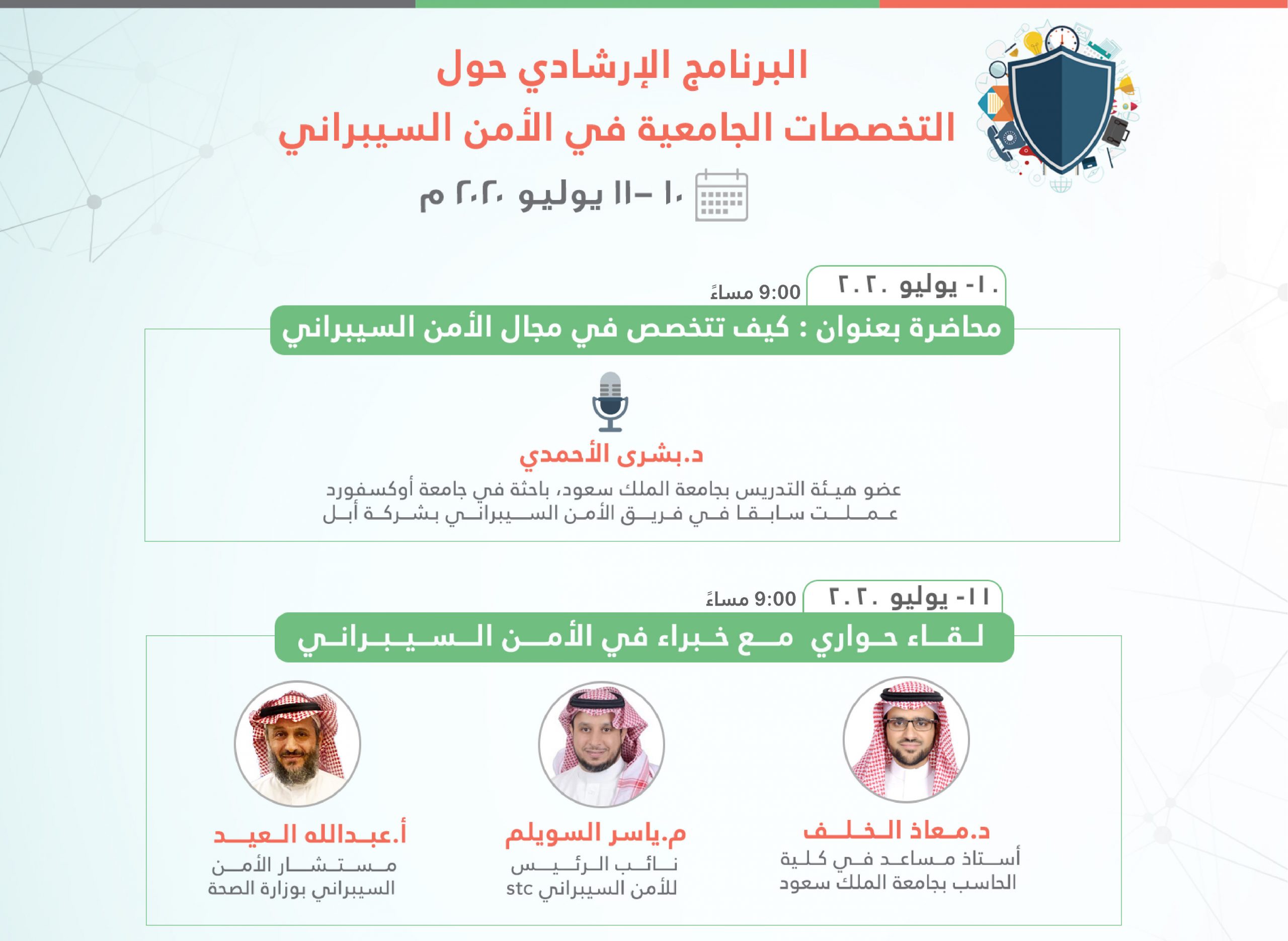في خطوة لتسخير خبرات الأعضاء أقامت جمعية أمن المعلومات (حماية) البرنامج الإرشادي حول التخصصات الجامعية في الأمن السيبراني وذلك خلال يومي الجمعة والسبت الموافق ١٠ – ١١ من شهر يوليو ٢٠٢٠م